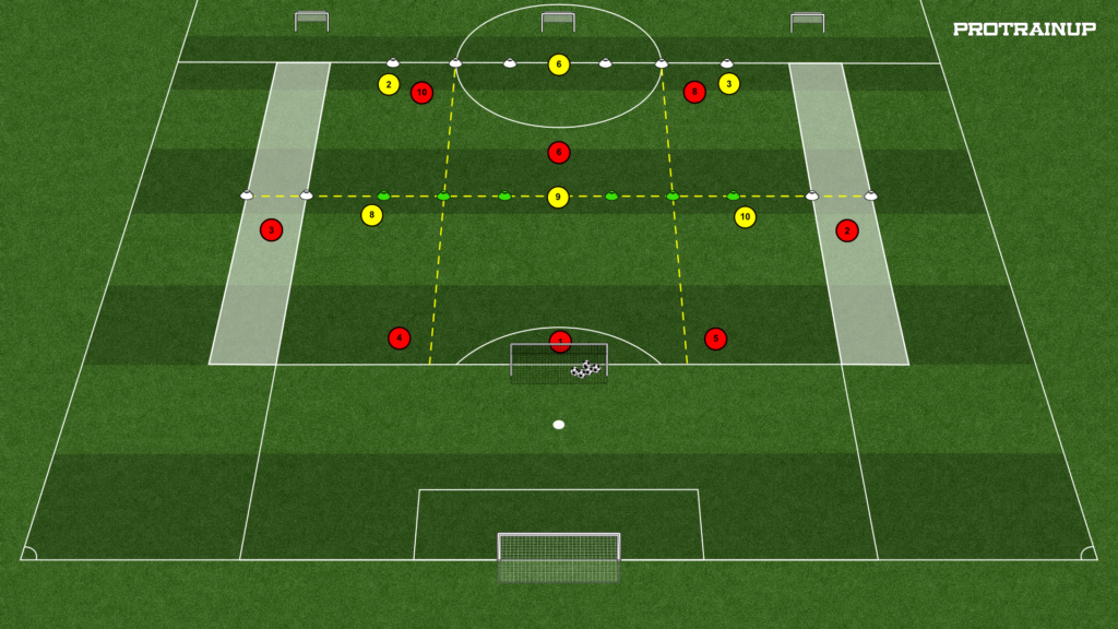 *Restrictions: at least 1 player in the side lane (attackers); defending player in zone 1 may not lower into zone 2 before the ball is in it