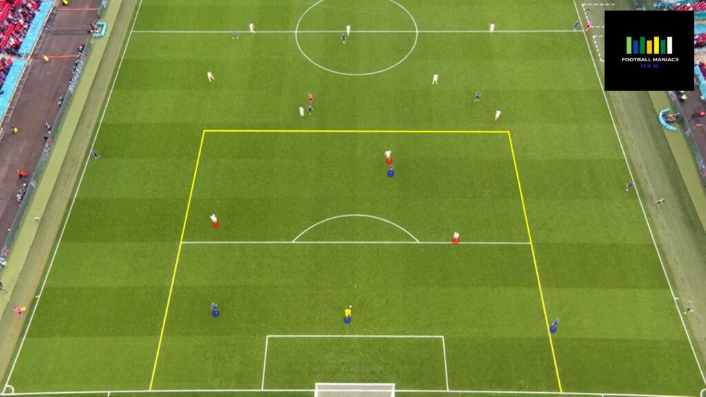 -Współpraca zawodników w strukturze rombu – realizacja konceptów gry pozycyjnej: wolny zawodnik, wbiegnięcie trzeciego, prowadzenie/podania piłki w celu skupienia uwagi przeciwnika